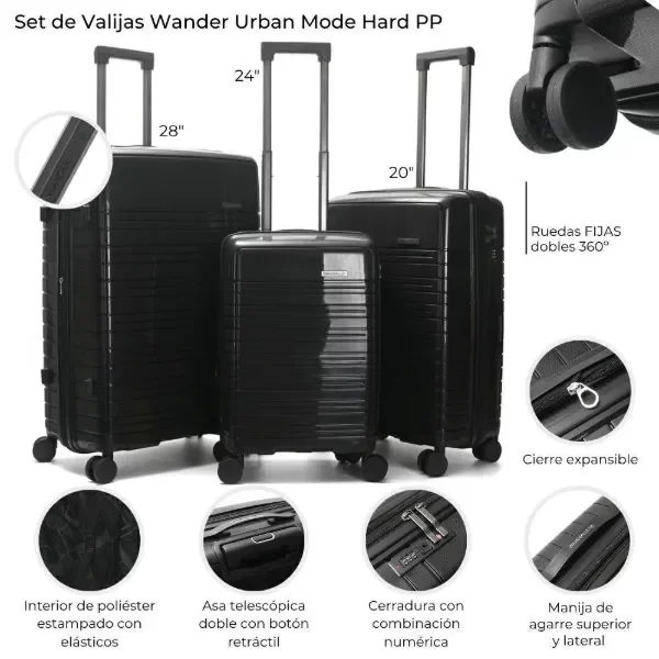 Descubrí el set de valijas Wander Urban Mode Hard "PP", diseñado para viajeros exigentes que buscan resistencia y comodidad en cada viaje.